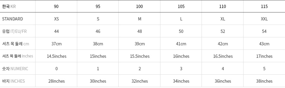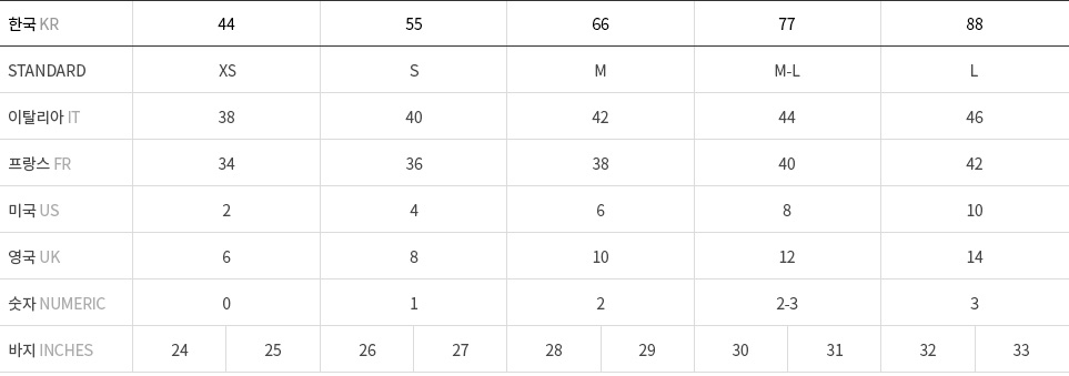 차트는 참고용이며, 브랜드와 스타일에 따라 차이가 있음을 유의하시기 바랍니다. 정확한 정보를 얻고 싶으신 경우 고객센터로 문의바랍니다.